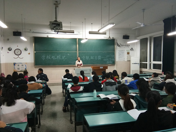 为迎接公司校规校纪考试,加强新生校史校情的学习,培养遵规守纪意识,养成文明健康的行为习惯,进一步形成优良校风、学风。11月6日晚,在公司楼 2050302教室17级网新、动画专业召开“公司规校纪,守规矩方圆”的主题班会。会议由辅导员张雁主持。
