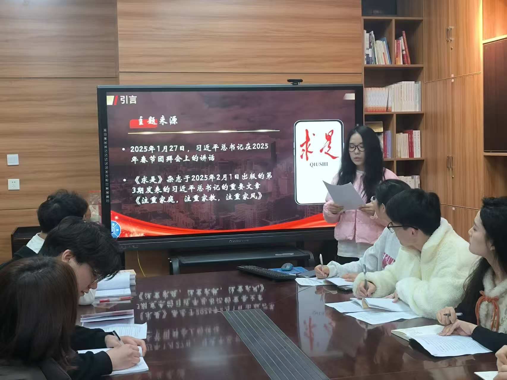 会议伊始,2022级网络与新媒体专业的马卓越同志带领全体党员进行理论学习。围绕“弘扬家风教育,凝聚奋进力量”主题,深入学习习近平总书记春节团拜会讲话精神以及《注重家庭,注重家教,注重家风》文章内容。通过对春节团拜会的起源、意义及总书记讲话中奋斗、团结主题的解读,引导党员思考如何将理论与自身学习、工作相结合,以自我革命提升素质、服务群众。同时,对注重家庭、家教、家风的重要性及实践要求展开探讨,强调党员在家庭和社会中应发挥的积极作用。