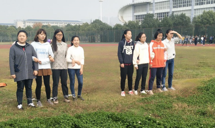 四人五足,增加默契感。游戏规则是用绳子把4个人的腿绑在一起,分6~8组,路程为100米,先到者为胜。四个人五条腿走路是很困难的一件事,100米的路程考验的是同学之间的默契。通过这个活动项目,有效的增加了同学们的默契。
