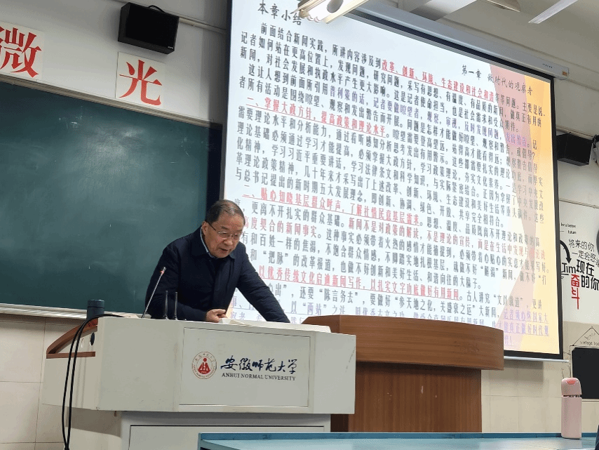 3月4日晚18:30,公司特聘教授、人民日报安徽分社原社长、高级记者刘杰在行知楼2050402教室开展“头版头条的写作艺术”专题讲座,新闻学主任张荻主持活动,2023级新闻学专业全体同学参与学习。
