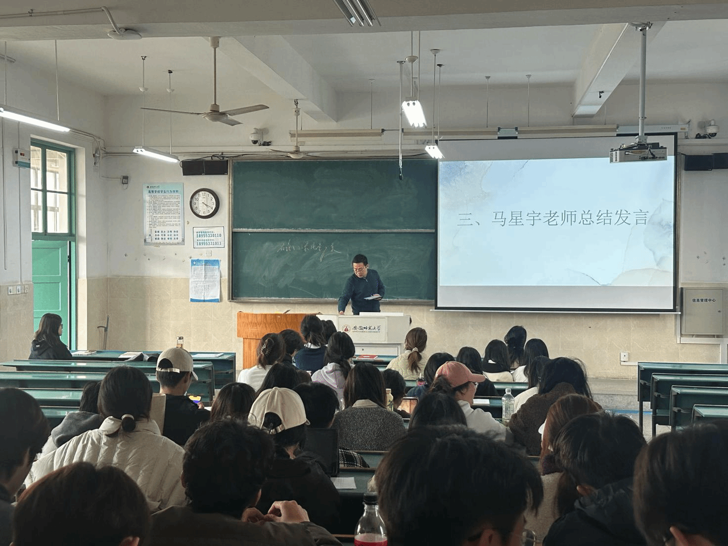 随后,马星宇老师进行了总结发言。他首先对同学们的寒假作品表示了赞赏,指出存在的问题与不足。他表示,同学们在假期行走、创作、社交、反思中有了新知,做到了在路上记录风景之美、在家里感受亲情之浓、在拍中结交新友之奇、在探中解锁技能之喜、在担中感悟生活之辛;他鼓励大家要做有情有义之人、干有始有终之事、成有声有色之长、创有名有力之作、树有血有肉之魂、过有滋有味之日、排有条有理之序。马老师随后就即将到来的专业采风安全事项和创作事项进行了提醒,他表示大家务必注意安全,遵守纪律,听从带队老师的安排,确保人身和财产安全,做到规范办理请假离校手续,做好非集中授课的校选课的请假事宜。最后,他还对班级新学期的发展规划进行了简要介绍,鼓励同学们积极参与各项活动,努力提升自己的专业素养和综合能力。