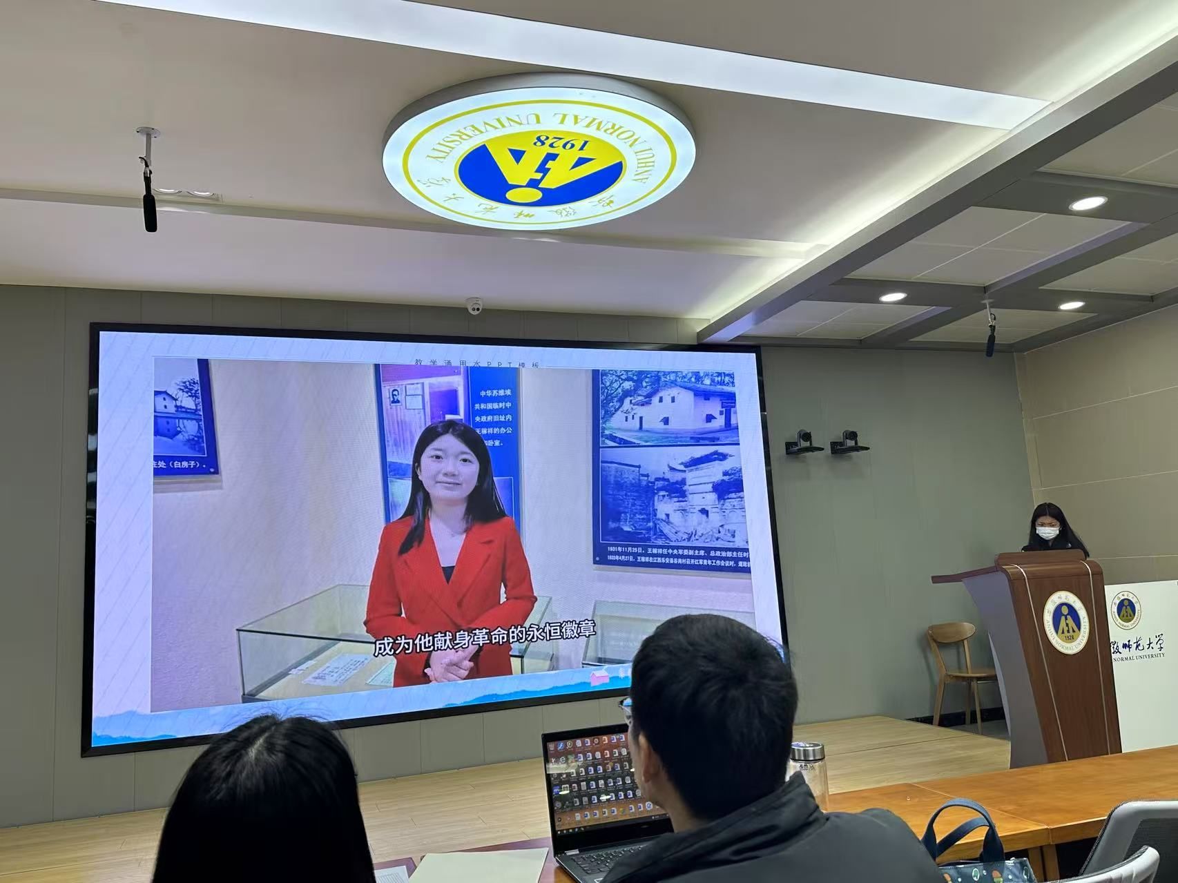 马鑫瑶同学结合在阜阳融媒体中心的实习经历,讲述了参与新闻短视频制作的流程。她与徐冰月、栗雅晴合作完成的“党史故事我来讲”系列视频《王稼祥的故事》,通过走访王稼祥纪念园、查阅地方志资料,将历史事件与人物精神融入镜头语言。活动现场播放了该视频片段,真实的历史场景与生动的叙事引发共鸣。