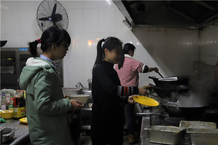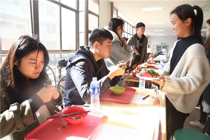 食堂后厨的材料琳琅满目、一应俱全,参赛的同学拥有充足的资源大展身手。比赛开始后,以班级为单位的比赛队员们分工明确,洗菜,择菜,切菜等准备工作均有条不紊地进行着,气氛十分热烈。准备好的食材刚与锅壁“亲密接触”,厨房里便传出浓郁的香味儿;外面,一双双筷子早已等好,等待着厨房内的最终成果。最后,每个小组都相应完成了自己的作品,桌子上有做工精巧、摆盘用心的山东水饺;有色香味俱全的土豆排骨;有酸甜可口、色泽诱人的菠萝咕咾肉;有油而不腻的红烧肉;有外焦里嫩的红烧鸡翅;还有让人眼前一亮的创意菜品花式水晶酿虾球……每盘菜从厨房端出都是精彩。