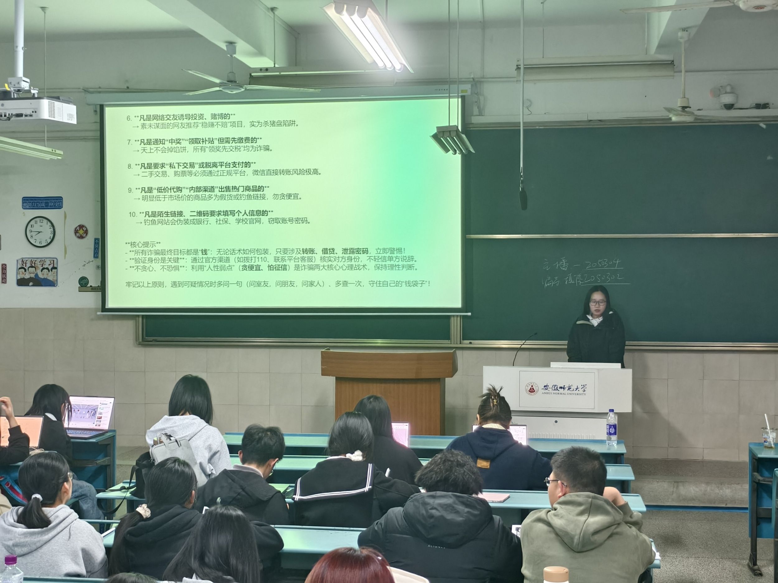 本次班会同时也对近期身边发生的几起诈骗案件进行了重点讨论与分析。通过对真实事件的分析,乌思琦老师提醒同学们提高警惕,不轻信不明讯息、不透露个人信息、不打开可疑网站地址、不轻易汇款转账,坚持“十个凡是”原则,并强调在遇到可疑情况时要第一时间汇报辅导员并报警。此外,乌思琦老师还鼓励同学们积极利用反诈骗APP、公众号等官方渠道,了解最新的诈骗手法信息和防范指南,不断提升自己的防骗能力,筑牢反诈防火墙。