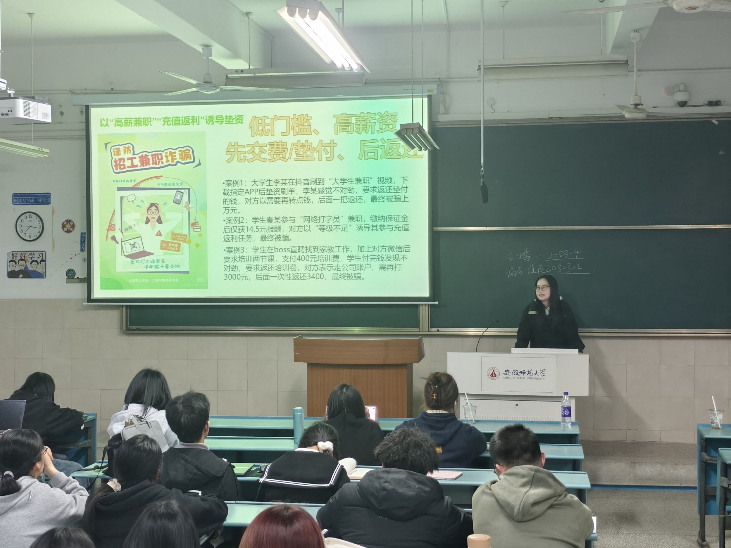 班会现场,乌思琦老师以各种网络平台上频繁出现的诈骗真实案例为引,通过PPT展示、视频播放、情景演绎等多种形式,剖析网恋诈骗、兼职诈骗、网购门票诈骗、刷单诈骗、游戏账号诈骗等常见诈骗手段,讲解相关防范技巧,生动形象地为员工们展示了诈骗的多样性和危害性,进一步加深了员工们对诈骗危害的认知。