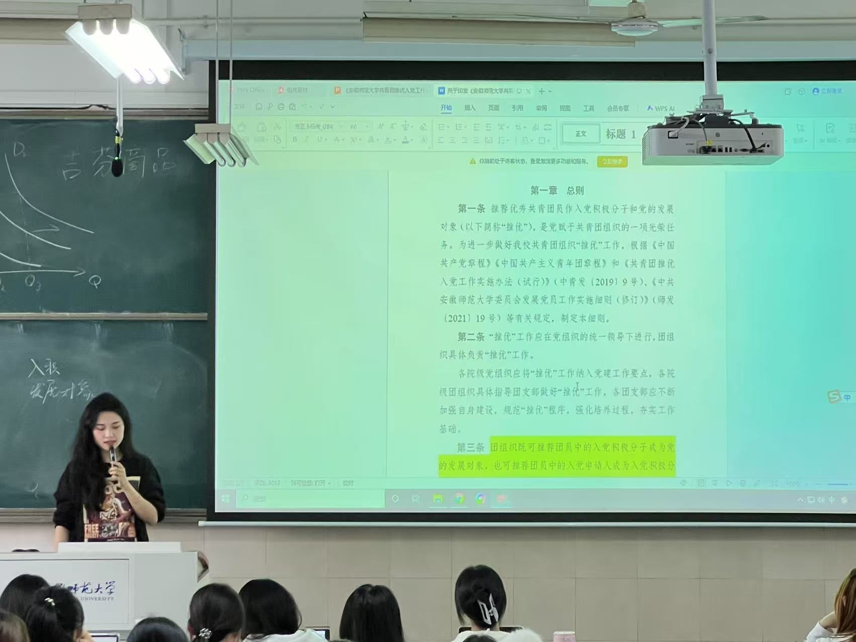 李梦圆着重强调了推优的工作流程。在整个推优过程中,召开团员大会是关键环节。在团员大会召开前,要求每一位候选人要进行自查,完成自我评定,深刻反思自身在思想、学习、生活等方面的表现,明确入党动机。只有清晰认识到自己入党的初衷,才能在未来的党员道路上坚定前行。她还介绍了投票规则,强调要秉持公平、公正、公开的原则,让每一位团员都能充分行使自己的民主权利。随后,还介绍了后续考察工作,包括对候选人在学习生活、社会实践、群众评价等多方面的长期考察,确保选拔出真正优秀、符合党员标准的青年。