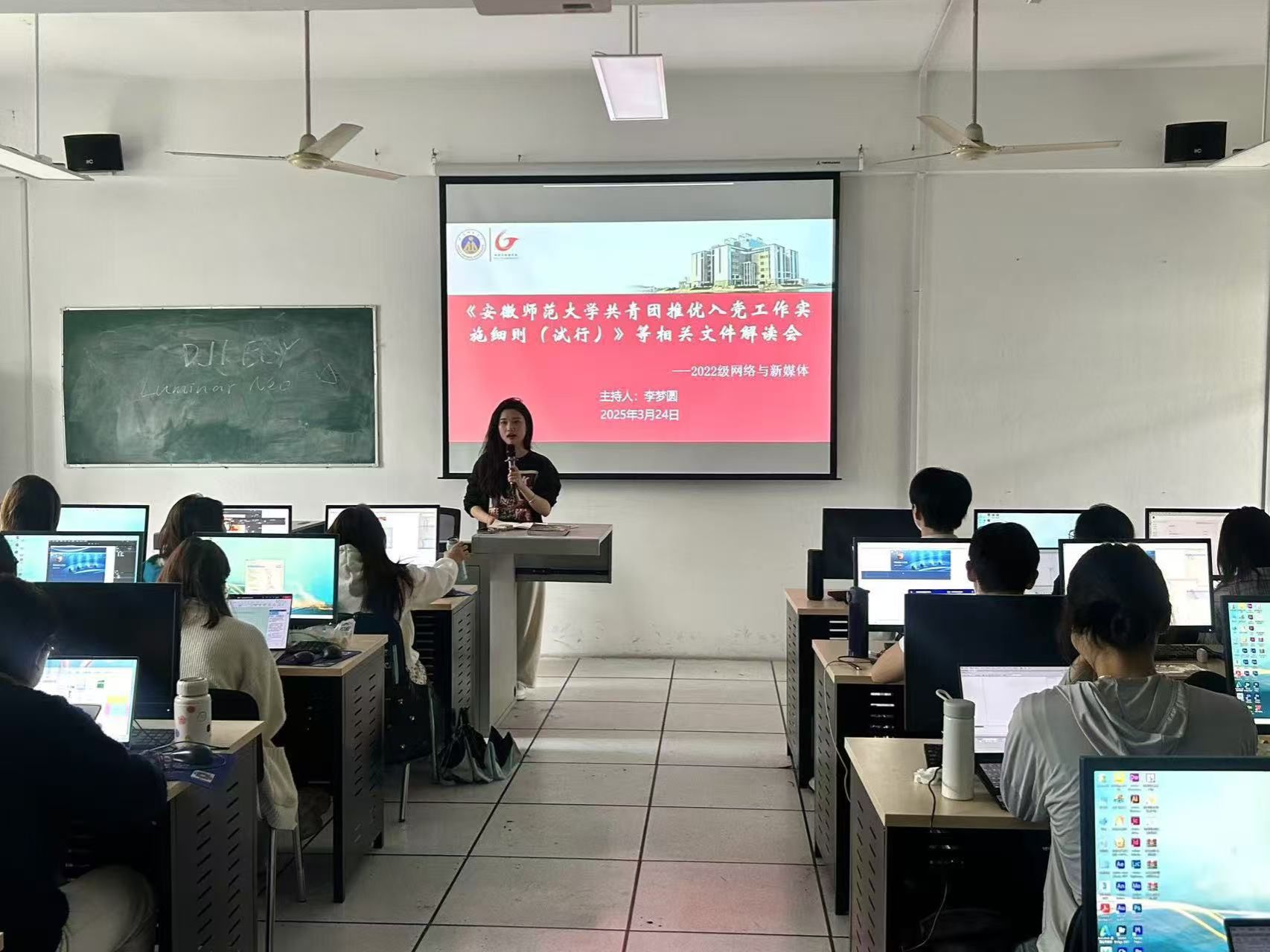 为有序推进共青团推优入党工作,切实加强党对青年工作的领导,引导广大青年积极向党组织靠拢,3月24日下午,2022级新闻学、广告学、网络与新媒体、播音与主持艺术专业在辅导员李梦圆的带领下开展了《TapTap点点官方网站共青团推优入党工作实施细则(试行)》等相关文件解读会。此次活动聚焦推优入党的各项要求与流程,为怀揣着入党热忱、渴望投身党的伟大事业的同学们照亮前行之路。