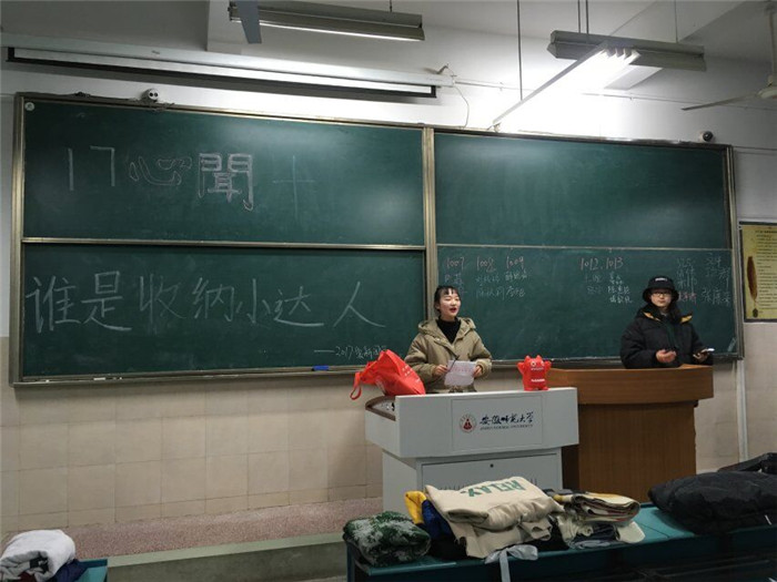 12月4日晚,17级新闻班举行了收纳小达人竞速比赛。比赛围绕日常用品的整理收纳展开。本次比赛总共分为三轮,分别是选拔赛、复活赛以及决赛,比赛内容主要是以叠放衣服和收拾整理桌面杂物为主。选手们通过本次比赛交流经验,增进友谊,同时旨在促进文明宿舍建设。各寝室长作为评审团,并组成大众评审对选手们的整理结果进行投票。
