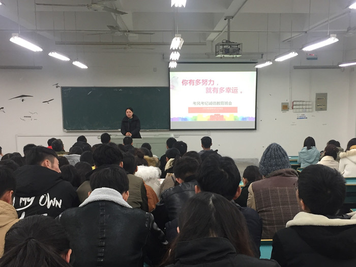 “一泓诚信静心,万卷答题自成。”为营造文明有序的考试氛围与优良的学习风气,督促同学们以积极向上的心态迎接考试,12月20日,2015级空乘专业召开了以“你有多努力,就有多幸运”为主题的考风考纪诚信教育班会,会议由辅导员老师余梦雅主持,全体同学参加。