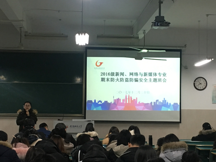 每逢期末,便是对本学期出现的各种疑难杂症的总结并开出处方,其中,火、盗、骗“三位一体”安全问题又备受广大师生的关注。12月20日晚7:00,在辅导员张雁的主持下,16新闻与网新专业于花津校区2030403教室召开了一场期末防火防盗防骗安全主题班会。