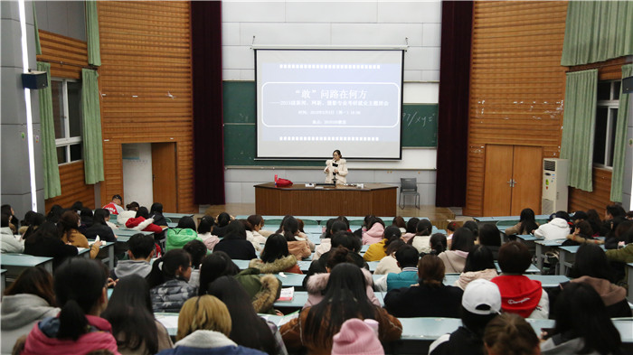 2018年3月5日晚19:00,2015级新闻学、网络与新媒体、摄影专业,在2010105教室,召开了以“敢”问路在何方为主题的的考研就业专题班会,会议由辅导员老师张虹主持。
