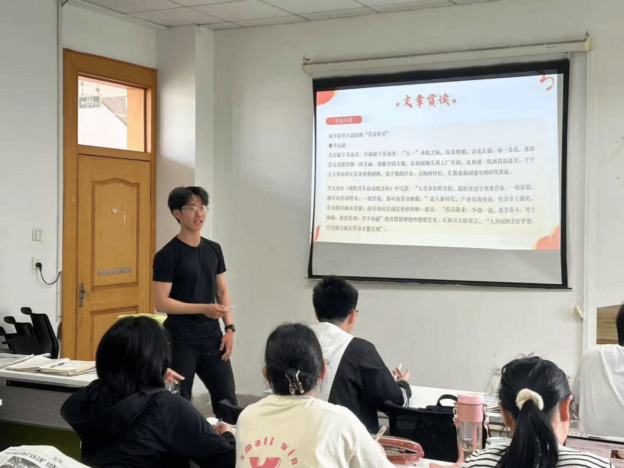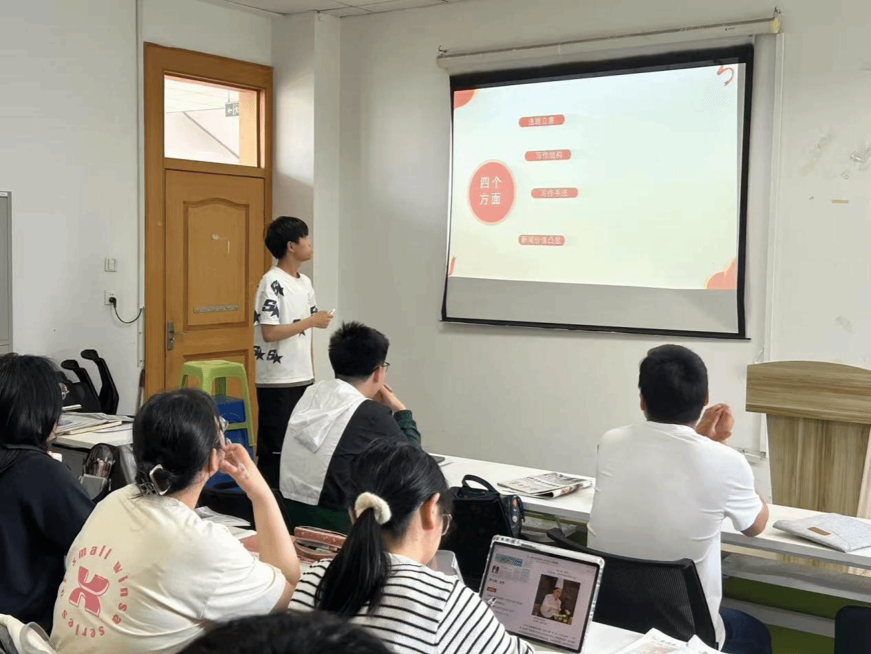 王一鸣同学带来新闻评论《和平是军人最好的“劳动奖章”》的分享。他先从五一劳动节前夕的发表背景阐述文章内涵,探讨军人维护和平的劳动价值;接着围绕标题展开,介绍隐喻转化、行业对比、情感共鸣等修辞手法,指出标题设计与“以小见大”手法的关联;而后从特点、影响等方面赏析文章逻辑严谨、语言感染力强等优点,还分享了新闻评论与写作的注意事项。