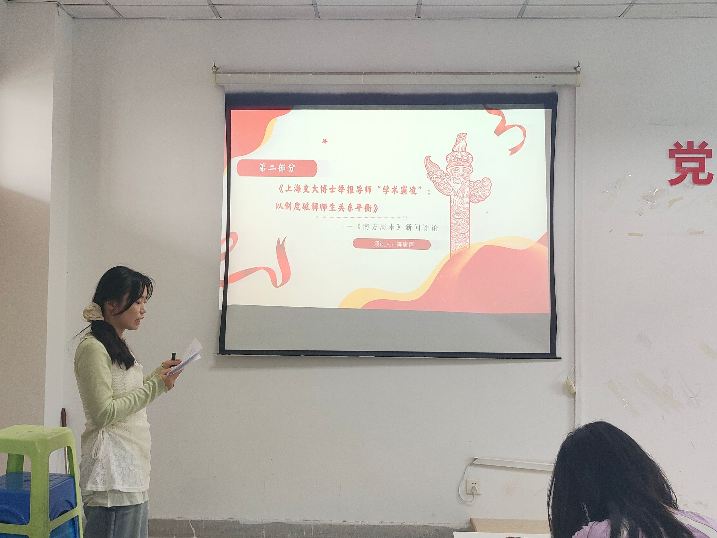 陈唐莲同学向同学们分享了评论文章——《上海交大博士举报导师“学术霸凌”:以制度破解师生关系平衡》。陈唐莲同学向我们简要概述了该新闻事件的背景及事件性质。其次,陈唐莲同学逐段分析了文本。从具体行为到伦理批判;从权力机制到系统危机,实现了从现象到本质的理论跃迁。最后,陈唐莲同学对该文章进行了总结,强调了新闻评论“以小见大”的公共价值。“正如评论中所言,‘高校师生关系不能继续这样下去了‘唯有将权力关进制度的笼子,才能守护学术共同体的尊严与创新活力。”