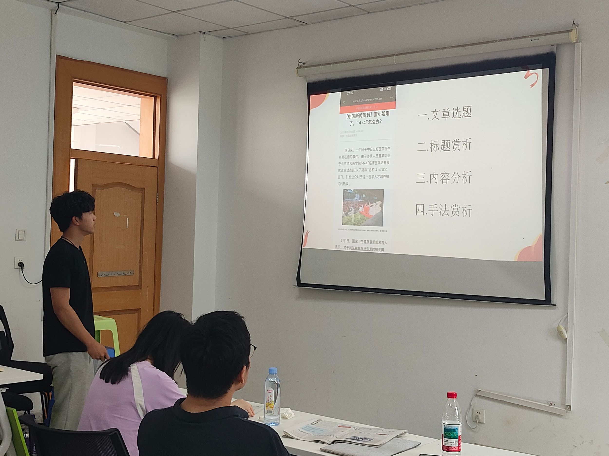 罗宇辰向大家分享了评论《董小姐塌了,“4+4”怎么办?》这一文章。罗宇辰同学首先概述了此新闻事件,并从标题、内容、手法三个方面进行分析,层层递进,由浅及深,全面地剖析了该文章。最后,罗宇辰向大家强调了文章中所体现的时效性与真实性。