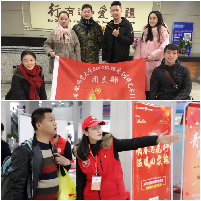 另外,公司2015级空乘专业团支部在寒假期间穿上红色小马甲出现在合肥高铁站,参加合肥市的春运“暖冬行动”志愿服务,他们几乎每时每刻都是站着,重复几千遍地挥动手臂为旅客指明方向,同时他们还要担任起为旅客们搬运重大行李、劝导旅客文明出行、维护站台秩序和应急救援的工作。2016级广告学、2016级新闻学、2017级新闻学等班级同样积极开展了爱心义卖、探访孤寡老人、铲雪除冰等志愿活动。就是这样一群师大的新传学子,从细微处入手,用自身的行动和温情为这个冬天增添暖意。