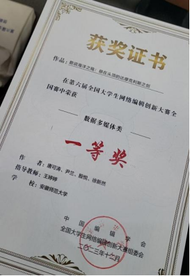 学术赛事是她向内探索的另一战场。与舍友组队参加全国网编大赛时,她首次与中传、复旦等高校的优秀学子同台竞技。“看到差距的同时,更感受到激励——原来我们可以在更高的平台对话。”这段经历让她深刻认识到,学术探索不仅是知识的积累,更是与优秀者同行的成长契机,抱着学习与突破的心态,她们团队凭借扎实的专业知识储备、默契的协作能力以及对创新内容的精准把握,最终斩获大赛一等奖。