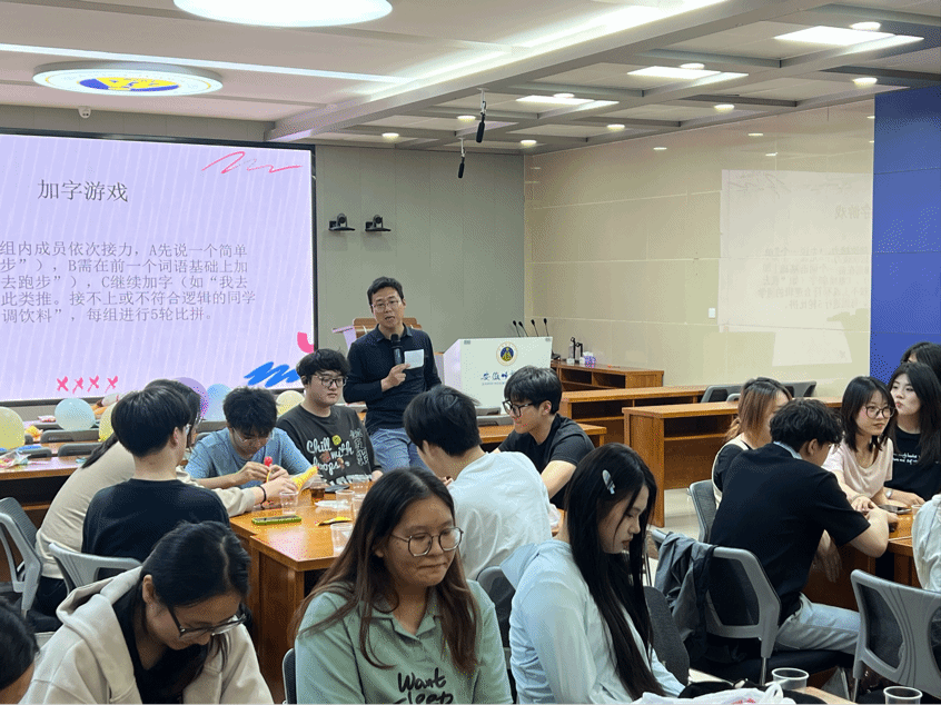 随后的“加字游戏”将现场氛围推向新的高潮。随着游戏推进,难度不断升级,同学们绞尽脑汁、妙语连珠,现场爆发出阵阵笑声。在轻松诙谐的氛围中,同学们的反应能力与语言表达能力得到充分锻炼。最令人心跳加速的“闹钟炸弹”游戏,将紧张感拉满,现场充满欢乐的气息。在“抽牌模仿”环节,同学们纷纷化身“戏精”,用夸张的动作和惟妙惟肖的表情,将模仿对象演绎得淋漓尽致。这个环节更是拉近了同学彼此间的距离。