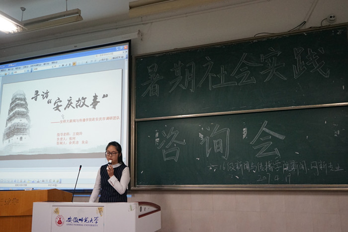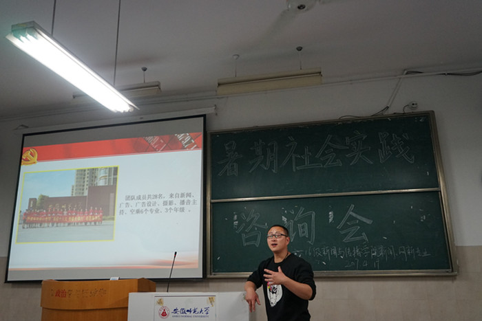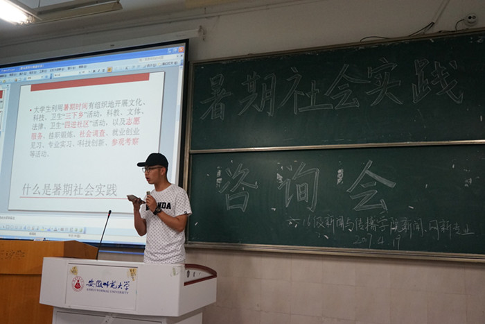 孙文首先以公司的相关文件为基点,为同学们详细讲解了何为暑期社会实践,并逐条介绍了暑期社会实践中“七大板块”的内容,让同学们进一步明确暑期社会实践的内涵。暑期社会实践活动是一个锻炼新传学子专业技能的绝好机会,孙文用自身多次参与暑期实践的亲身经历阐释了暑期实践活动的意义和价值。暑期社会实践虽然只有短短的十几天,却足够让同学们走出校园,看到社会的真实风貌,体验基层生活的酸甜苦辣,丰富老员工活的内涵。孙文展示了2016年暑期赴宿松实践团队调研过程中拍摄的照片,时值暴雨倾袭,镜头下武警官兵抗洪抢险的无声话语触动了在坐同学的心灵,催生了同学们对暑期实践意义的思考。