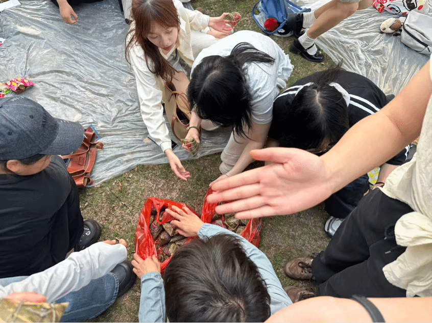 游戏环节结束后,活动进入温馨的“粽香情谊”分享时刻。班委们将精心准备的节日心意——热气腾腾的粽子和各种各样的小零食,进行分发。大家围坐在小垫子上,品尝着软糯香甜的粽子,分享着小零食。粽叶的香味和轻松愉快的交谈声在空气中交织着,拉近了彼此之间的距离,同窗情谊在美食与分享中悄然升温。