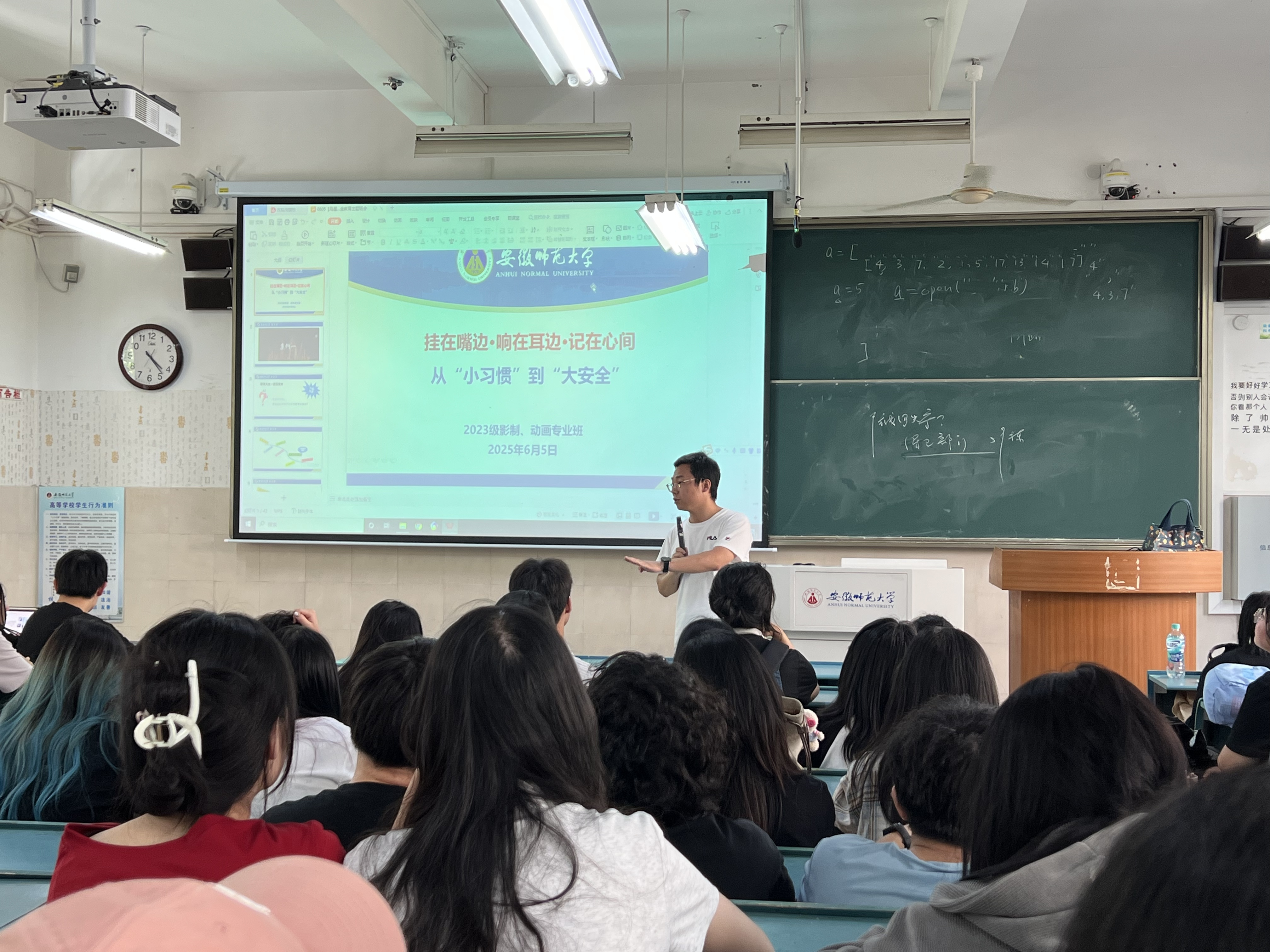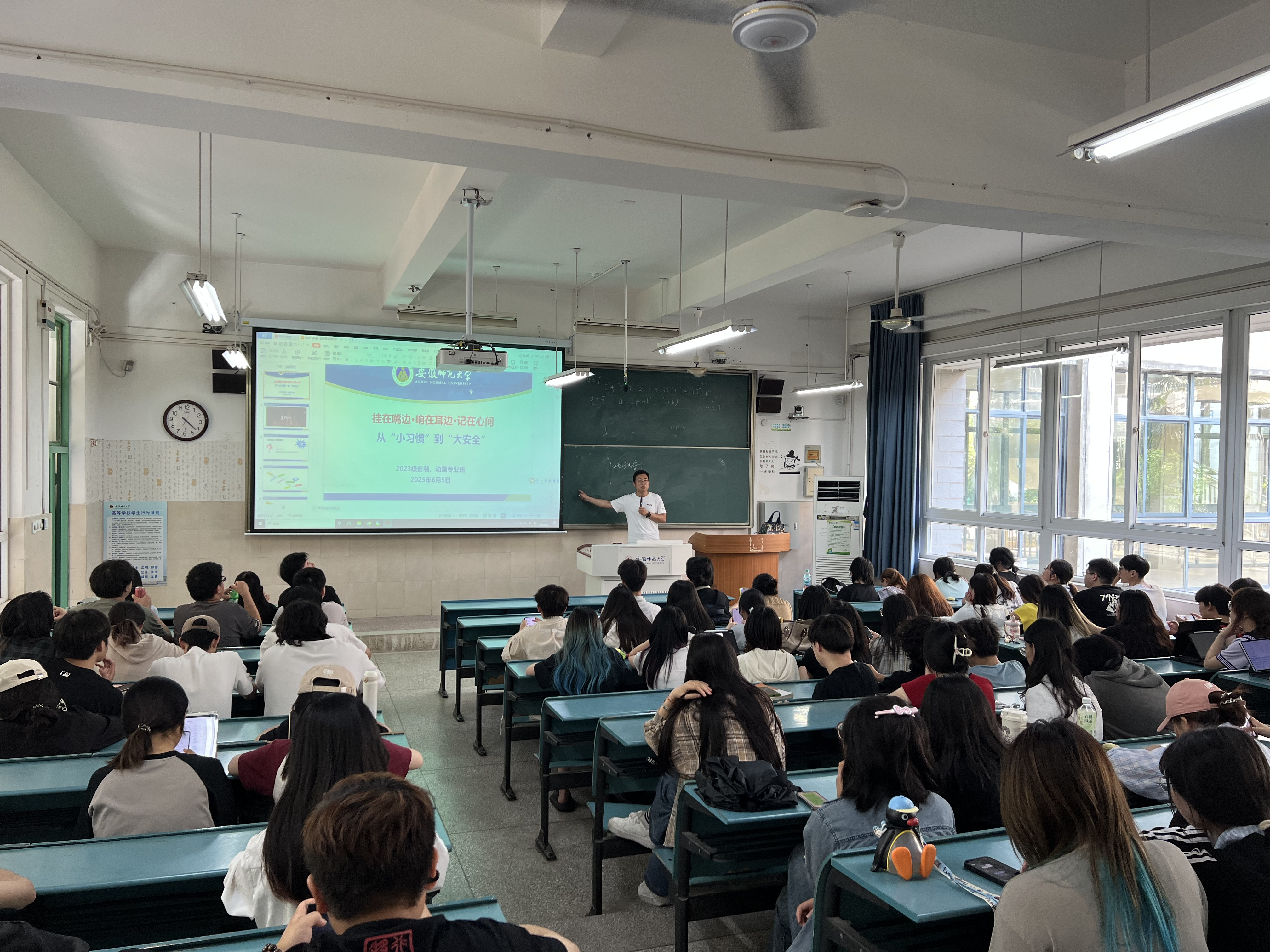 为了强化同学们的安全意识,提升员工安全防范能力,营造和谐校园环境。6月5日下午,23级影视摄影与制作、23级动画专业共同召开校园安全主题班会。马星宇老师围绕校园安全类型、安全意识习惯、安全防范举措等展开深入讲解。