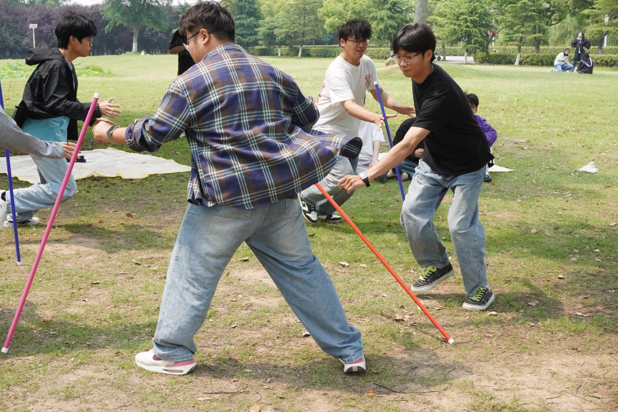 紧接着,“不倒森林”“你是谁”“一圈到底” 等精彩游戏轮番登场。在 “不倒森林” 环节中,同学们小心翼翼地保持直立棒不倒,同时快速完成换位,一次次的配合让彼此间的默契悄然生长;“你是谁” 游戏里,大家通过写画自我描述,在互相猜测中发现室友未曾展现的一面;而 “一圈到底” 时,小组成员手拉手,在不松手的规则限制下,齐心协力传递呼啦圈,在互相鼓励中共同完成挑战。这些妙趣横生的游戏,让同学们在互动中增进了感情,也看到了室友身上独特的闪光点。