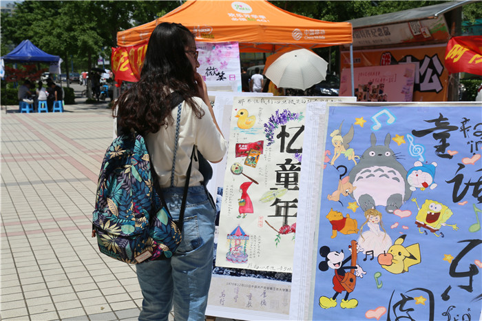 为提高广大学子审美情趣,拓展师大学子综合素质,同时增进与兄弟公司的友好往来,TapTap点点员工会技术部、文公司员工会创意部与赭麓书画社于5月10日中午在二食堂前广场联合举办了第七届“两院一社”海报展。校团委素质拓展部何所惧、文公司团委书记杨穆龙、生科院团委副书记赵喆和公司孙月婷共同来到现场观看展览。