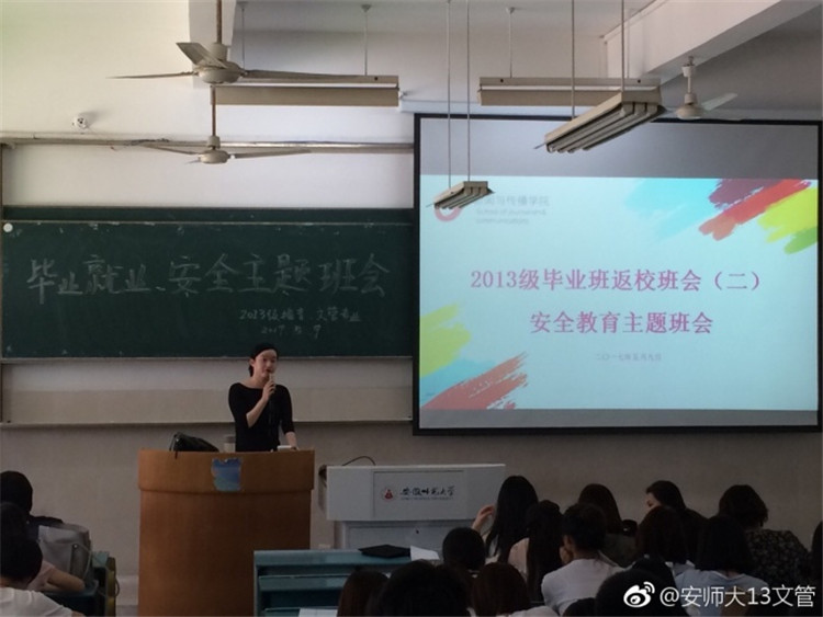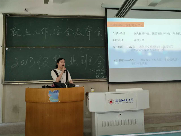 5月9、10日,2013级新闻、广告、文化产业管理、播音与主持艺术四个专业分两场在2030103教室召开就业推进及安全教育主题班会,会议由辅导员郁悦主持,四个专业全体员工到场参加。