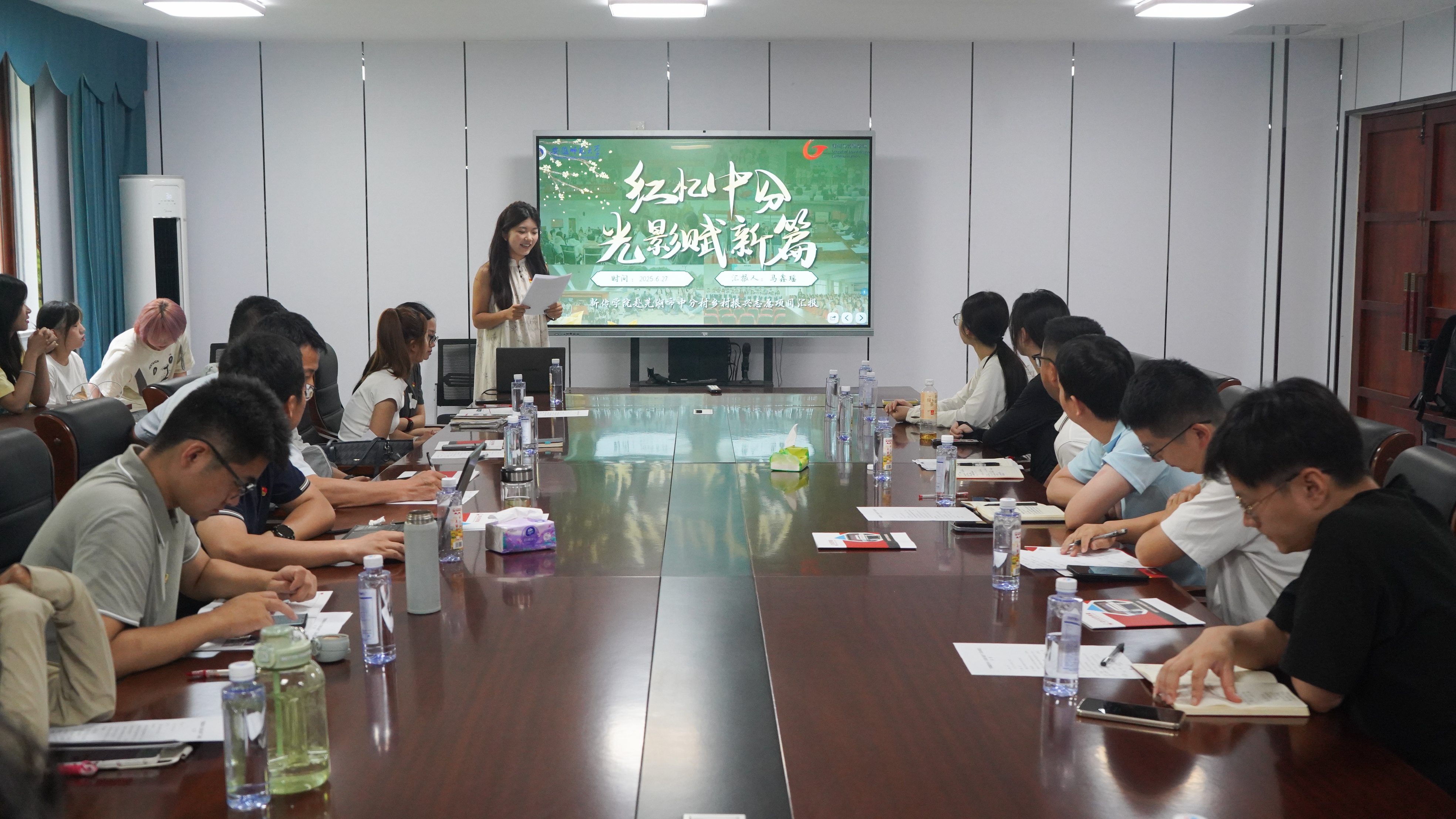 紧随展播,项目负责人、2023级播音与主持艺术专业团支书马鑫瑶代表“红忆中分光影赋新篇”小分队进行了工作室阶段性工作汇报。马鑫瑶首先介绍了由15名跨专业、多才多艺员工组成的团队核心,包括擅长策划与影像叙事的她本人以及摄影摄像剪辑全才李杨可心(其主导的“银龄写真计划”深受村民喜爱)。她说,团队成员在各类竞赛和实践中锤炼的执行力、创新力与协作力是项目成功的基石。谈及选择中分村的缘由,她深情指出,这里厚重的红色底蕴(14处省级文保单位)、优越的区位优势(繁昌慢谷核心区)、丰富的文旅资源,以及在乡村振兴战略下面临的创新活化红色资源、提升传播力的迫切需求,正是新传学子施展才华、贡献力量的热土。