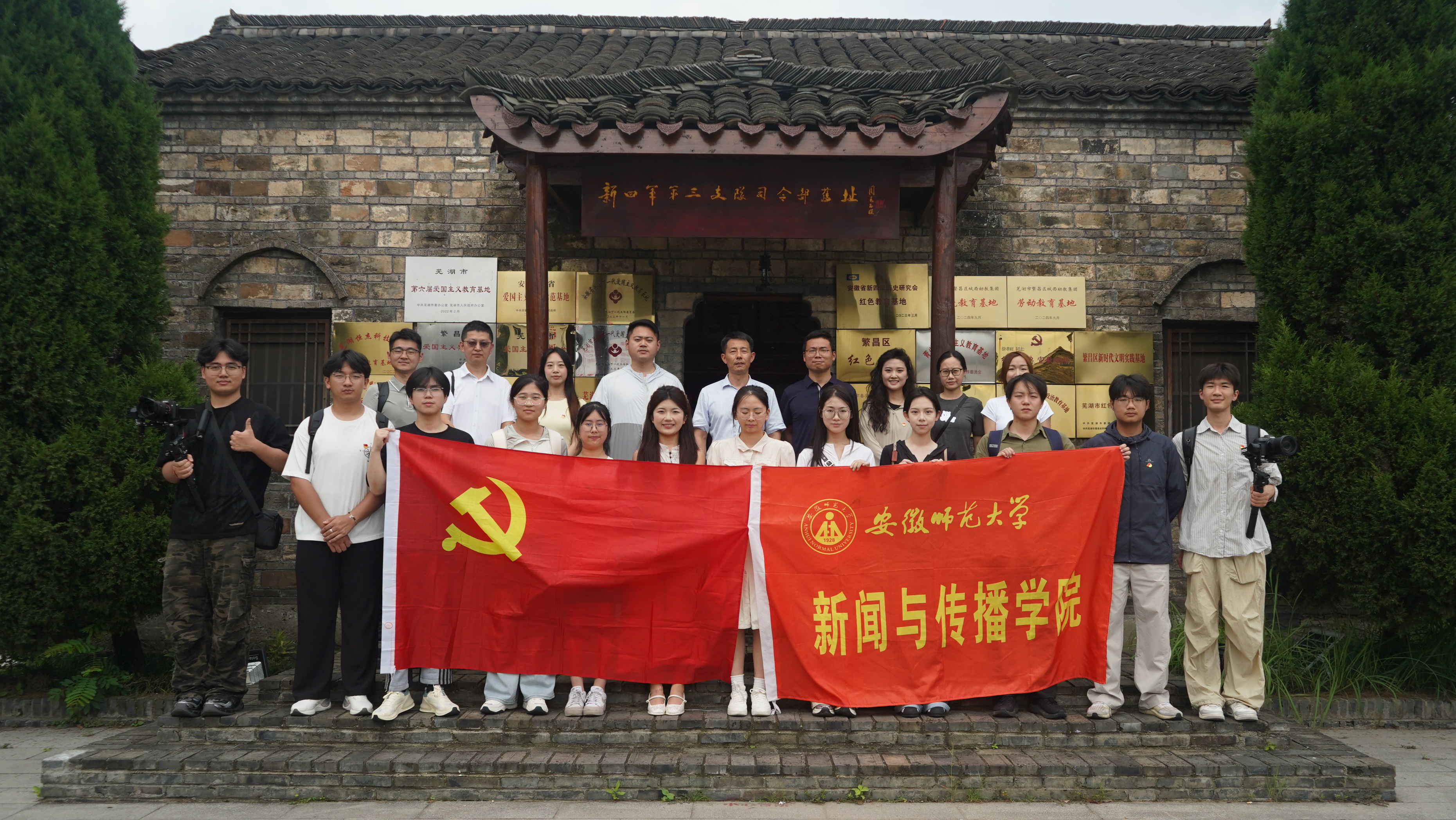 村口“绿茵”繁茂的“将军连理树”见证和承载了中分村悠久又厚重的红色文化历史,中分村第一书记、驻村工作队长赵华杰早早地在村口等待,师生一下车就热情地向大家介绍,“连理树不仅寓意谭震林将军率领的红四军‘繁昌保卫战’的红色文化,‘连理、连理’也更是代表着中分村和睦美好的人情。”随后,赵华杰带领全体人员参观了新四军支队司令部旧址,在历史遗迹中感受“红色”文化的厚重底蕴。在司令部旧址,大家围坐一堂,支部书记刘熠、李梦圆,马星宇依次于现场开展微党课,结合革命历史与乡村振兴战略,为同学们上了一堂生动的实践教育课。在乡村振兴与美好乡村建设实地考察环节,赵华杰带领员工们深入了解中分村的村容村貌、产业发展现状,切身感受乡村振兴战略实施以来“蓝色”产业的迅速发展,为后续传媒赋能项目积累实地认知。