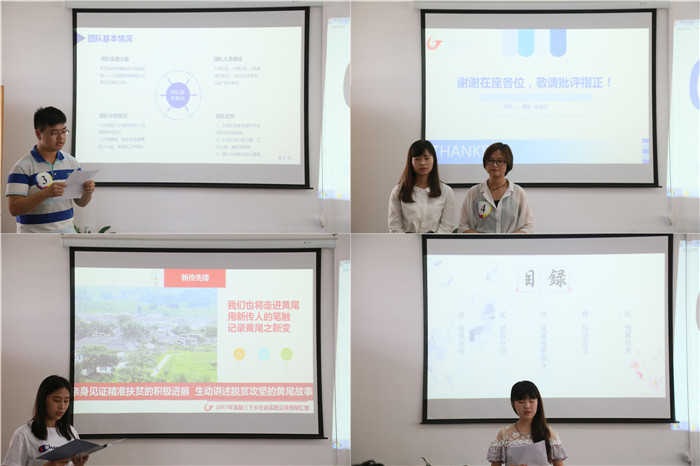 各支暑期社会实践团队依次上台汇报并进行现场答辩。爱心中转站赴芜湖市区调研环卫工人现状暑期社会实践团队表示“我们想让更多的人知道这样一个群体需要关注,需要理解。”“赴婺源探寻传统建筑,记录古村之魂”暑期社会实践团队则目光投向了日益消逝的古村落上,“我们希望自己不仅仅是婺源古村落现状的调研者,更是保护古村落思想的传播者和古村落现状的保护者。”“心藏一份人文关怀,脚沾一些乡野泥土”,为结合建军九十周年主题,实地调研“小三线”建设,探索现代民宿的现状,赴皖南“寻迹家国情怀,感知现代乡愁”暑期社会实践团队将前往黄山奔赴三年之约,纪念军魂恒久,撒播知识大种,跟随时代脚步,感知现代乡愁。“一次扶贫主题行,一次素养大练兵”,赴皖西“聚焦脱贫攻坚,躬听黄尾故事”暑期社会实践团队将扛起志愿服务的大旗,付诸最热忱的实践,奔赴在脱贫攻坚的最前线,汇报人来妤婷最后说道:“这个社会始终需要有深度、有温度、有厚度的新闻人和新闻故事,尽管力量微薄,却是老员工为助力精准扶贫事业献出的一份热忱。”