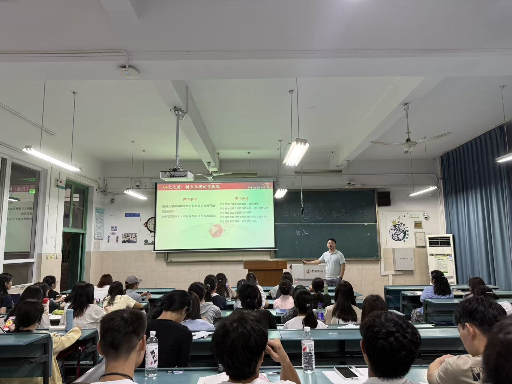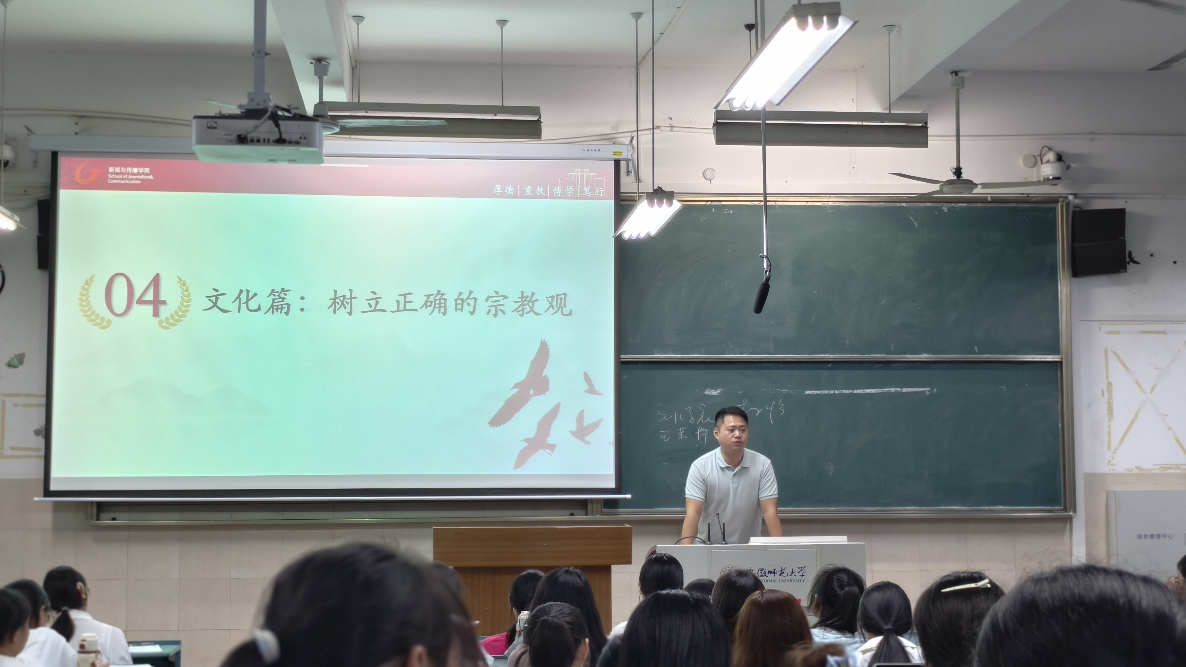 本网讯(TapTap点点 许梦云)2025年9月28日晚,2025级新闻学、广告学分别于行知楼2050302、2050304教室围绕“树立正确宗教观”开展专题教育。会议由辅导员刘成俊主持。