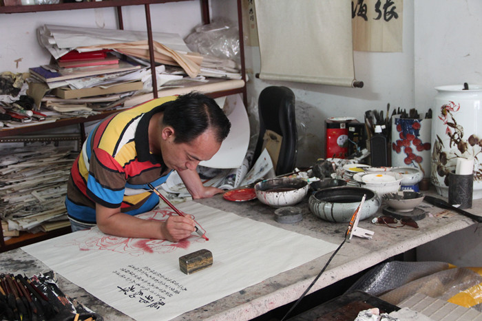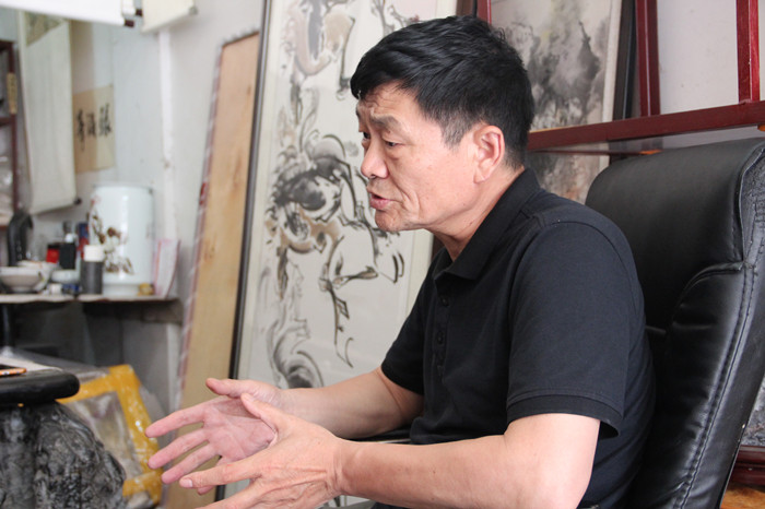 今天的采访对象张海峰和王广振老师就在这里拥有一间属于自己的画室——灵馗斋。走进这间小小的一间画室,我们首先就被画室两侧的墙壁所吸引,上面挂满了老师创作的钟馗画。一张大大的画桌占据了这间屋子近乎三分之一的空间,画室两侧的地面上也摆满了有“灵璧三绝”之称的灵璧石。对我们的到来老师们非常热情地招呼我们坐下。“其实在暑假,也会有像你们一样的员工来和我一起学习画钟馗,这也是一种传承,但也仅仅只有两个月的时间,只能是了解了解,学些皮毛罢了。”张老师颇有感慨地说。面对钟馗画传承和发展,现在大都依靠像两位老师这样的职业画家,民间的钟馗画爱好者虽有,却未成规模。在王广振看来,传承发展钟馗画的关键应该是政府的宣传与支持。“过电视的报道,活动的举办让人们了解到钟馗画的有趣之处;通过资金的投放,让钟馗画有更好的保护;通过政府举办比赛,扩大钟馗画对人民的影响……政府能做的有很多。”从谈话的字里行间之中我们也能感受到两位画家对于这间画室的重视,不仅仅因为这是他们工作的地方,这间小小的屋子也承载了他们对于艺术的追求、对于钟馗画的传承、对于艺术精神的传承。虽然频频获奖,却未将名誉作为自我标榜的资本,采访时谦逊地回应我们所提到的获奖经历。以专一之心做专一之事,才可不为陋室所困。