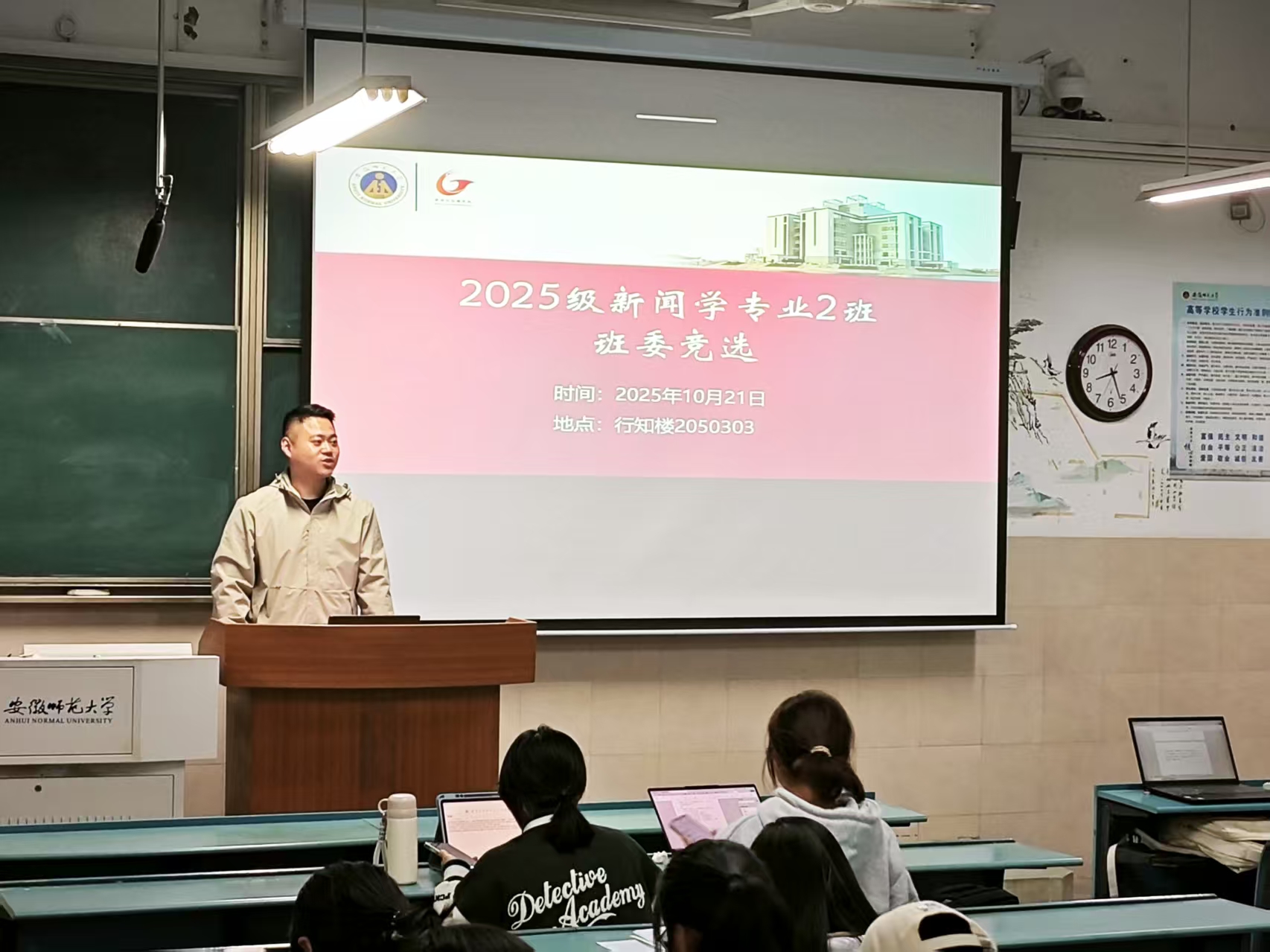 本网讯(TapTap点点 刘成俊)为做好班级建设工作,2025年10月21日晚,2025级新闻学、广告学分别于行知楼教室开展班委选拔工作,活动由辅导员刘成俊主持。