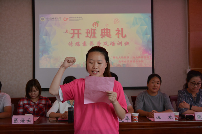 最后,志愿服务团队队长喻馨君带领全体志愿者宣誓,徽州区教育局副局长庄建华以洪亮的声音宣布传媒素养普及培训班正式开课,全体队员与领导老师合影留念。
