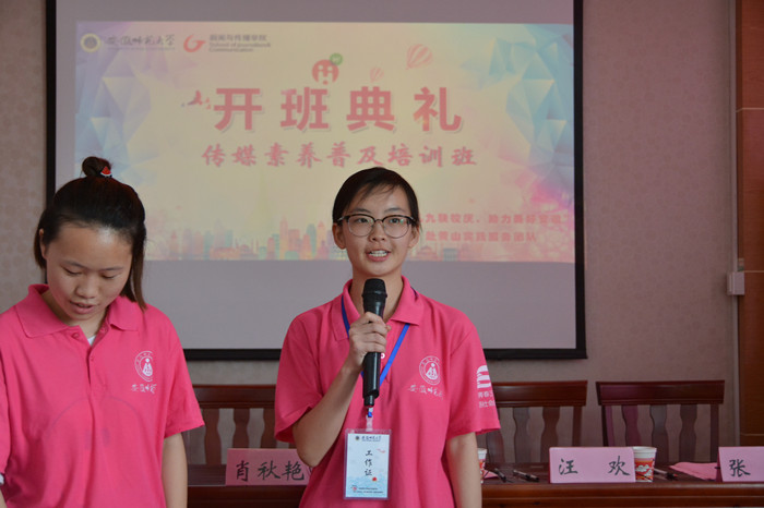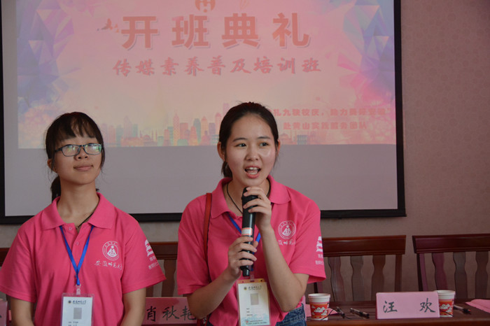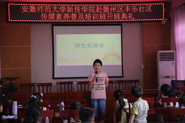 “我们希望能利用自己所学专业为孩子们传递知识,分享快乐”,传媒素养普及培训班班主任、实践队员李越就培训班的具体授课情况并代表所有授课老师对培训班教学作了承诺,团队精心制作的任课教师介绍视频欢乐逗趣,引得孩子们连连大笑。
