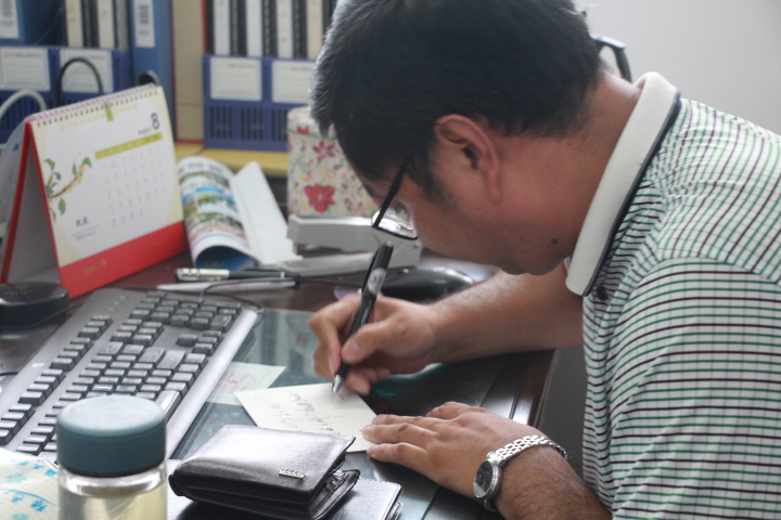 简单的条纹短袖,黑色的长裤,胖胖的脸上带着憨厚的笑容,黑框眼镜的背后有着一双睿智的眼睛,这是他给我们的第一印象,也符合每一个人心目中对于高中教师的经典形象。说起话来,和善温柔的话语又似乎与我们印象中的数学老师有所不同。他是郑少成,现任徽州一中高中部的政教处主任,也是一名数学科目教师。