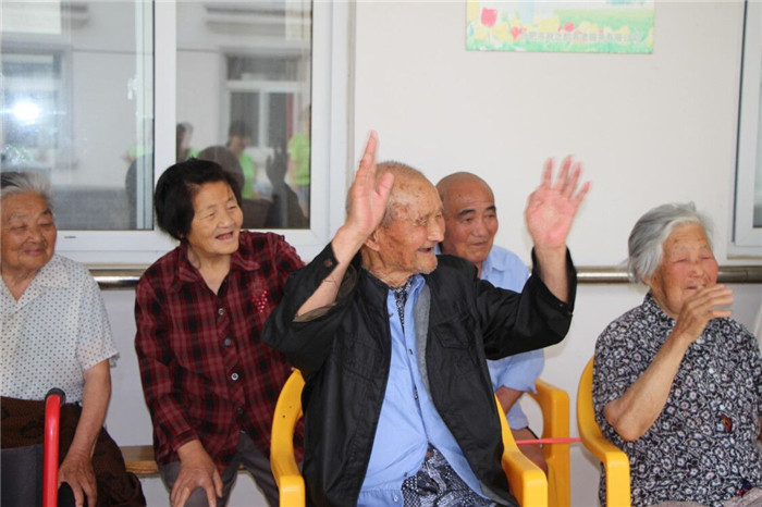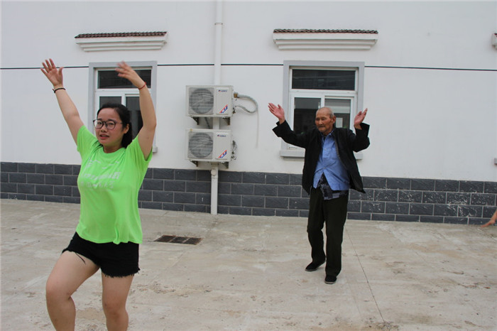在第二次表演小苹果的时候,在搀扶下,九十多岁的郑爷爷从轮椅上起身加入了我们,兴致十足地挥舞着手臂,模仿着我们的每一个动作,虽然手脚已经很不方便,动作也十分迟缓,但是郑爷爷依然十分用心地做好每一个动作。成员围着他组成一个圈跳舞的时候,郑爷爷笑得合不拢嘴,跟着音乐打着节拍。时间在此刻定格,夕阳西下的敬老院,一片欢声笑语中,这个新四军中的老战士恍若回到了少年。
