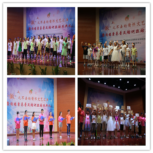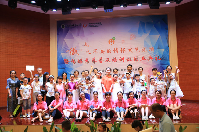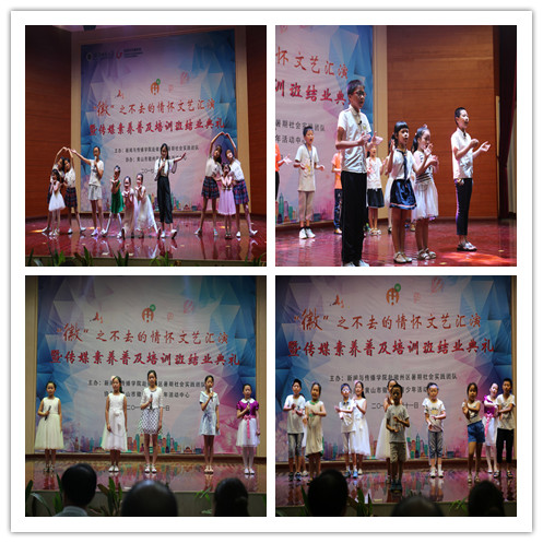 下午3点,汇演正式开始。文艺汇演由两个团队的孩子们用心演绎的歌曲串烧节目《最好的未来》和《重返十七岁》拉开序幕。朗诵节目《殷殷关怀暖徽州》 饱含深情;舞蹈《大王叫我来巡山》展现了孩子们的活力四射。作品展示环节,孩子们展示了在手工课上的风筝、扇子和剪纸等作品。节目《绕口令大PK》使大家领略了语言的魅力;话剧《从现在开始》则带大家走进了孩子们的“动物王国”。随后,两队分别播放了支教视频,视频中记录了传媒素养普及培训班中点点滴滴的动人瞬间以及任课老师对孩子们的寄语。教师朗诵《遇见徽州遇见你》讲述了教师们用行动践行生命的意义。最后,两队分别带来合唱歌曲《那些花儿》和《爱,因为在心中》,老师与孩子们手牵着手,紧紧相依,留下动情的眼泪,将气氛推向高潮。节目结束后,暑期社会实践团队的指导老师马星宇和张雁分别发表讲话,并给在传媒养普及培训班顺利毕业的孩子们颁发结业证书,最后合影留念。