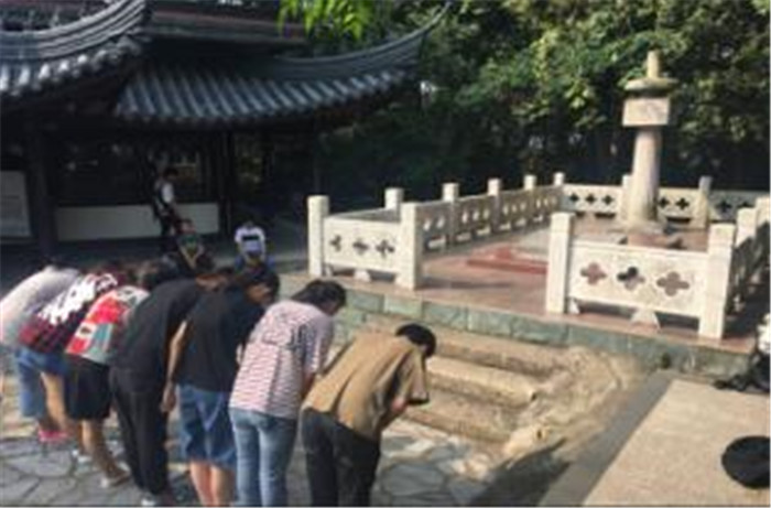在赭山顶,各个团小组的同学们庄严的向刘希平先生的墓行鞠躬礼,刘希平一生为教育事业做出极大的贡献,看完希平先生的墓志铭,所有的中英班同学都对先生肃然起敬。不忘当代年轻团员肩上的使命,铭记现阶段的受教育权利来之不易。吃水不忘挖井人,在这里每个团员都上了一节团课,来自先烈事迹的激励,也来自大家对团的意义的更深层次的思考。