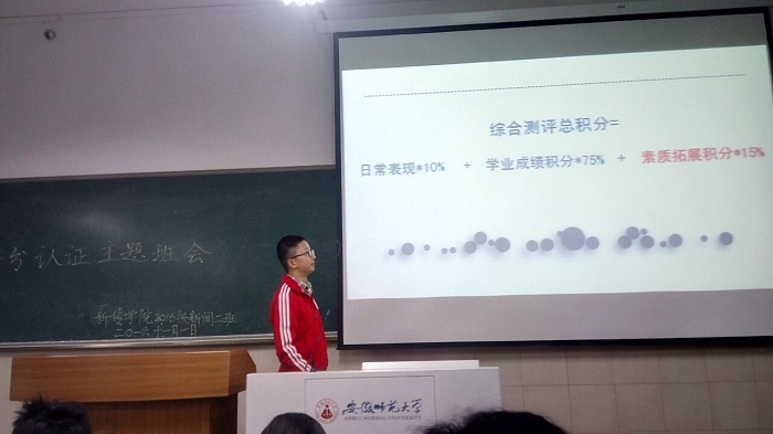 新闻班钱浩围绕如何得学分、怎样认证学分、学分认证细节与程序展开了此次的综合素质拓展学分分析。首先他介绍了my youth这一微信号,说明了一下怎样在网上报名活动,然后详细讲了几点需注意的地方。学分对于老员工来说是关乎切身利益的事,同学们都认真地记着笔记,关键的地方也用手机拍了照,有疑惑的便提出疑问,钱浩一一作答,确保每个人都能把握好要点。