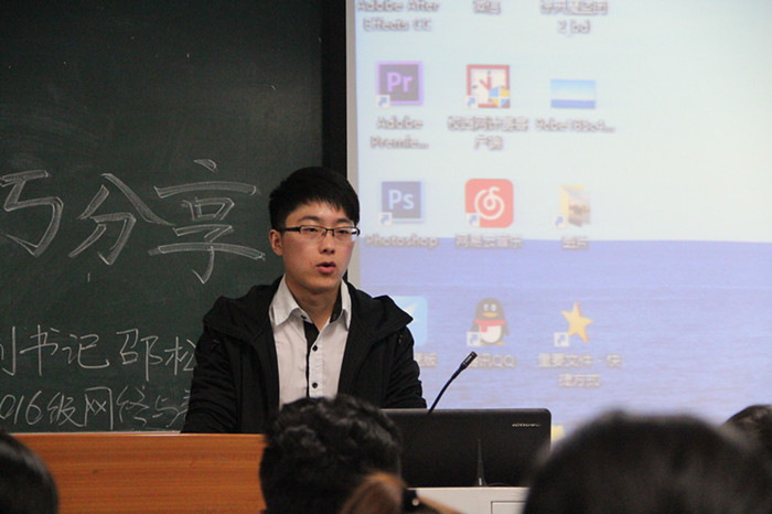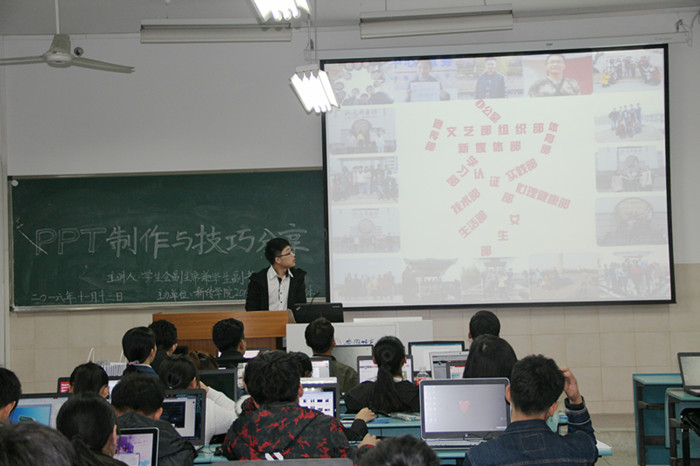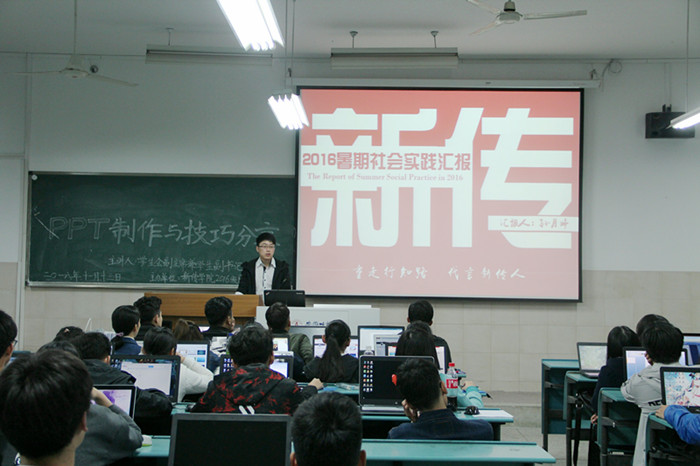 11月13日晚7点30,TapTap点点2016级网络与新媒体班级的同学们在2050504教室听取了现任院员工会副主席兼员工副书记的2014级新闻学专业邵松给同学们带来有关PPT制作的指导和技巧的分享。