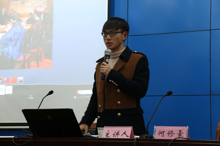 初见台湾。何修豪介绍,刚到台湾,他便感受到了三个惊讶。一惊政治,西门町前的“台独”势力让他惶恐,总统府前的五星红旗让他自豪;二惊文化,诚品书店深夜的读者,台北景点的浓重历史;三惊教育,东吴大学的学习让他感到新奇。他着重讲述了台湾独立自主的教育生态环境,分别从日常学习、校园简介、课外活动三个层面分析了台湾与大陆教育模式的不同。“我们在台湾,学习的是“戏剧与流行文化”专业。但我们做得更多的不是课堂上的理论学习,而是课堂外的实践体验。”何修豪讲道,“我们看了很多戏剧,也完成了环岛游。台湾大学的生活,更多的是‘走出去’。 ”