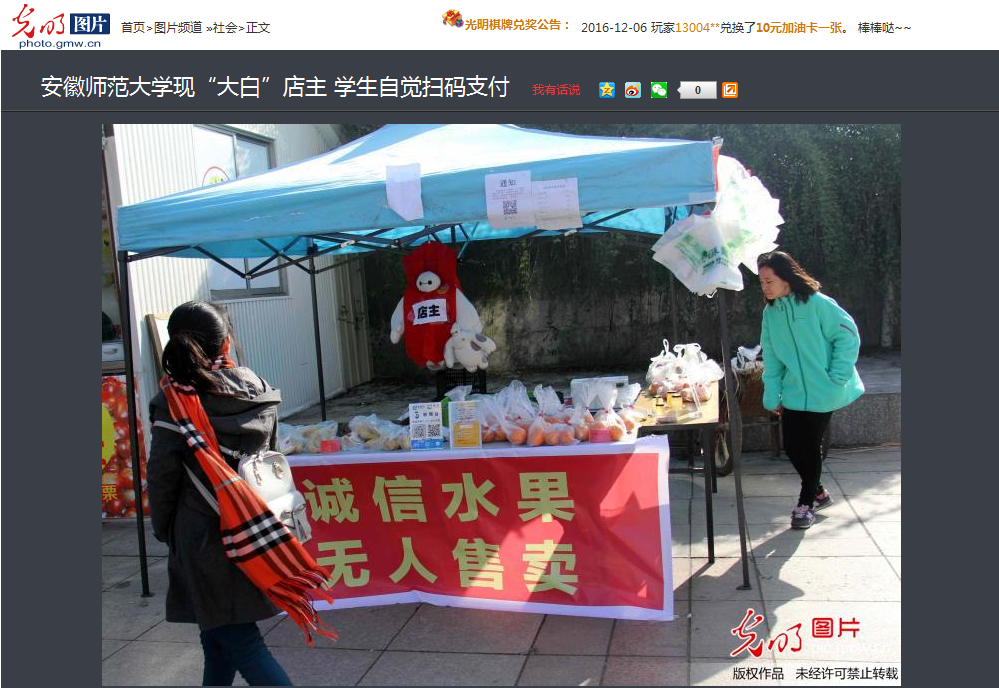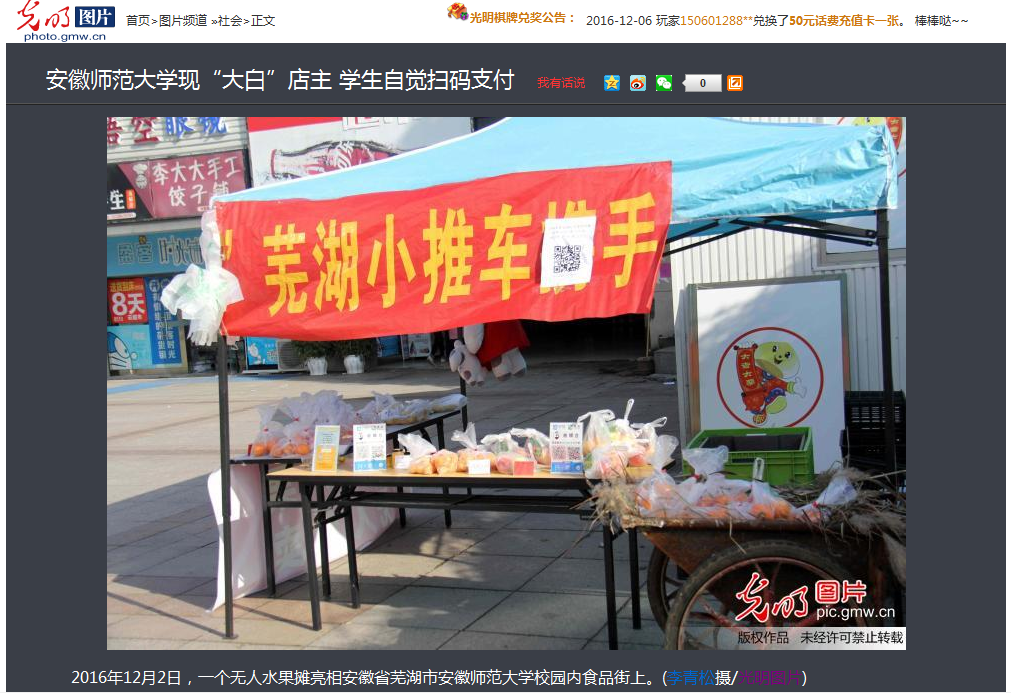 近日,《光明网》在专栏《光明图片》中图文并茂地报道了公司2015级空乘专业员工诚晨带领“芜湖小推车”的创业伙伴一起与“芜湖爱净菜”平台合作,在师大小食代广场前进行了无人诚信水果售卖的试点活动。同学们通过支付宝扫码付款和微信转账的方式购买水果,而店主则是大家熟悉的卡通人物大白。青春有为,创意无限。此次的诚信创意售卖活动进行得十分顺利,公司的相关部门给予了创业政策和场地的支持,而作为活动组织者的公司2015空乘专业的诚晨也和同学们在活动开展中锻炼了创业实战能力。