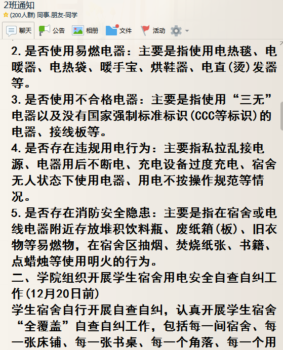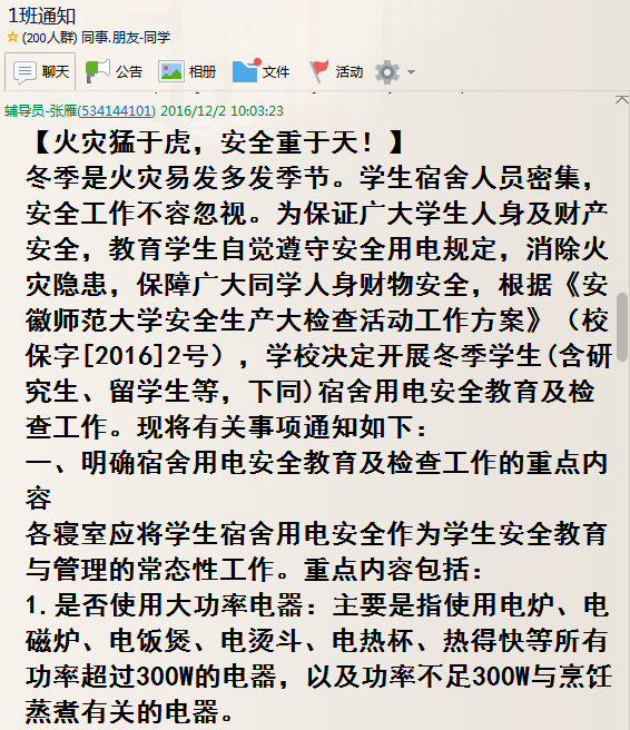 班群平台发布信息。辅导员在班级群里发布冬季员工宿舍用电安全的相关信息,包括大功率电器、易燃电器、不合格电器、违规用电行为以及存在消防安全隐患进行细致的介绍。给大家先进行用电安全的预热。