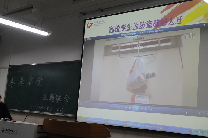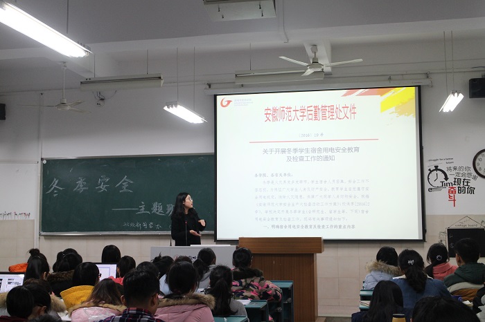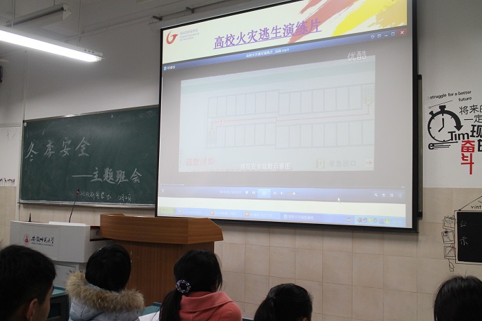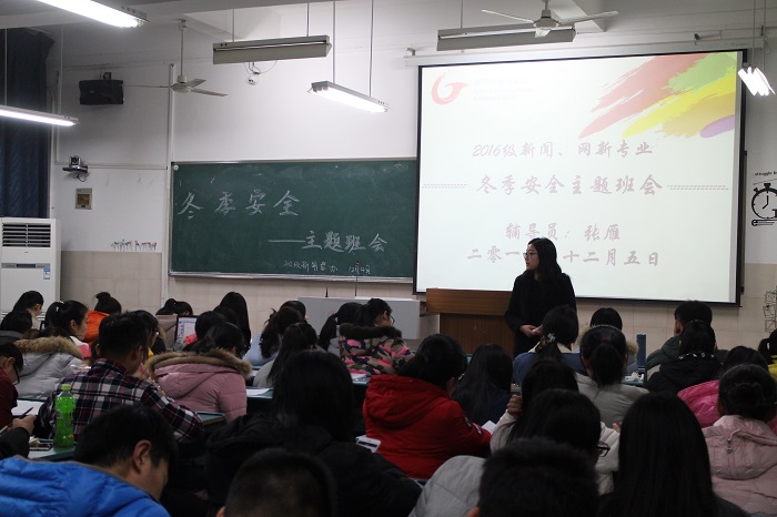 班会召开安全教育。12月5日-6日晚,16新闻、网新分别在各自固定教室开展了冬季安全主题班会,辅导员张雁主持了班会。会上,辅导员带领大家认真学习了《关于开展冬季员工宿舍用电安全教育及检查工作的通知》的相关精神。就寝室安全注意事项和寝室事故应急措施进行了详细的介绍,并和同学们一起观看了大公司园火灾视频、高校火灾逃生演练片,以及增强防盗意识的相关短片。在校园火灾事例中,同学们认识到自己身边可能存在的安全隐患,同时也意识到人在火灾面前的弱小。通过观看应急火灾演习视频,同学们也学习到了一些非常有效的应急措施如:要在火灾发生时保持冷静、被围困火场时不要轻易跳楼、在被困于火场时要锁闭好门窗,用湿毛巾掩住口鼻,等待消防员的援救、在逃离火场时要尽量放低身体沿承重墙快速前进等等。一段段视频吸引了同学们的目光,大家聚精会神观看的同时,也对冬季安全多上了一份心。