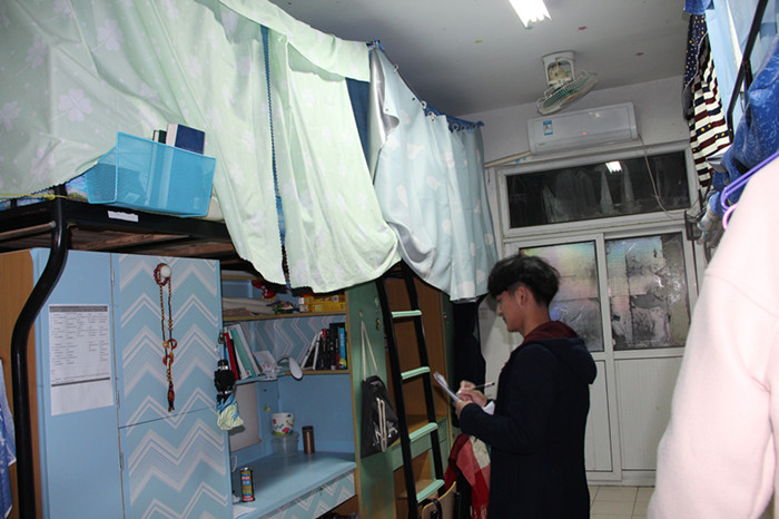 小分队们认真开展“全覆盖”自查自纠工作,每一间宿舍、每一张床铺、每一张书桌、每一个角落、每一个用电器都仔细的查看,均未发现任何违规电器及违纪行为。本次活动仔细记录了每个寝室存在的问题和闪光点。班委们与同学们也就寝室安全问题和卫生问题进行了交谈。最后在26栋楼下、食堂门口,各小分队进行了交流与总结。