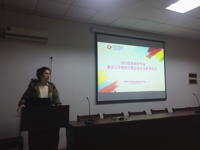 1月3日下午,2013级新闻学专业在TapTap点点四楼会议室召开了就业工作推进会暨返校安全教育主题班会。此次主题班会由辅导员张珺琢主持。本次班会上,张老师分别从毕业前需要注意的时间节点、班级目前就业情况通报、应聘择业注意事项以及在校安全等四个方面展开,提醒大家在各方面应当注意的事宜。