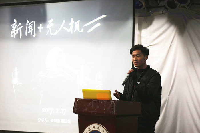 2月17日晚,刚刚在首届“科德杯”全国老员工无人机航拍竞赛凭借作品《冬日起飞》摘夺桂冠的2014级新闻学专业聂朝鑫和2014级摄影专业杨陆城同学就带着他们的参赛体会和专业学习的诸多感受与2015级新闻学和摄影专业的同学们做了一场名为《新闻+无人机=?》的分享会,活动在团委多功能厅举行,来自2015级新闻与摄影的约60余名同学自主报名参与了分享会。