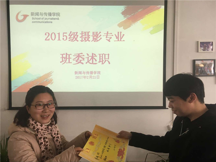 2月21日上午,在院员工会办公室,2015级摄影班举办班委述职报告会,本届班委会面向全班同学汇报履职情况,接受员工代表的民主评议,辅导员张虹全程参加了述职汇报会。