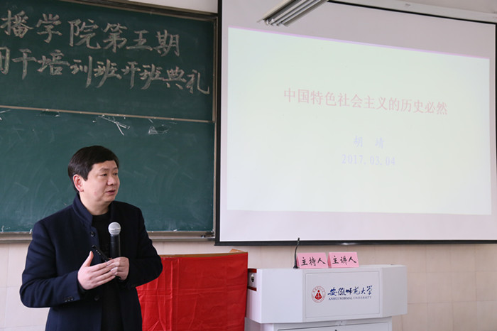 本次开班典礼上,胡靖为“青马工程”暨团干培训班成员做了开班第一讲。胡靖首先从宣智丽的故事切入,“从懵懂而从到真懂而信”他指出,共青团员的灵魂是信仰和信念,而现在则要着力解决一些团员理想信念模糊的问题。“我们要回到真正的马克思”,他以微博网友之问“共产主义什么时候才能实现?”这样一个引发争议的案例来进行分析。胡靖指出,对马克思,只有爱是不够的。信仰和信念的前提条件是理论的科学性、道路的正当性、执政的合法性。中国为什么要走中国特色社会主义道路呢?必须证明马克思主义是对的,必须证明中国现在的道路是马克思主义的,必须证明这条道路给国家和人民带来了最大化的利益。而这个问题则恰恰解决了马克思主义的历史正当性和中国特色社会主义的正当性。接着胡靖从“两个必然”和“两个绝不会”的历史结论向学员们抛出三个问题:共产主义运动为何遭遇浩劫?为何马克思主义作为革命的理论屡试不爽?为何马克思主义作为建设的理论屡遭挫折?从一些提前革命国家革命夭折到中国革命的历史正当性,再到社会主义初级阶段理论,他最后得出:“中国特色社会主义就是落后国家夺取社会主义革命胜利的必由之路;这是真正回到马克思主义的科学社会主义之路;这是中华民族的振兴路也是中国人民的幸福路。”